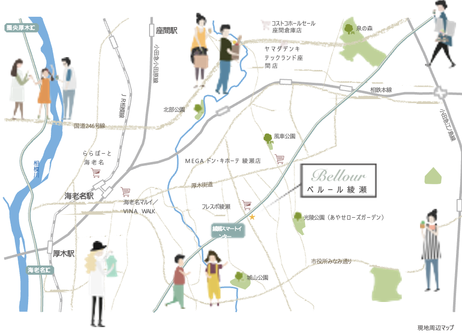 一方で厚木街道や国道246号線、東名高速道路「綾瀬スマートインター」も近く、大型商業施設が充実する海老名エリアをはじめ、週末には車を使って様々なおでかけを楽しめます。 -