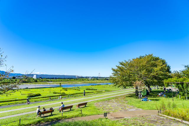 相模川沿いに整備された開放感あふれる心地よい公園。川向うに丹沢山系の雄大な山並みを望み、のんびりベンチで寛ぐもよし、園内をゆったり散策するもよし。春には菜の花や桜が目を楽しませてくれます。また多彩な仕掛けが施された巨大な複合遊具で遊べるわくわく遊具広場、水辺の生き物とふれあったり水遊びができる園内水路「鳩川」や、専用クラブとボール無料貸し出しに加え4歳~小学2年生は子ども用コースを無料で利用できるパークゴルフ場など、楽しみ方も多彩です。